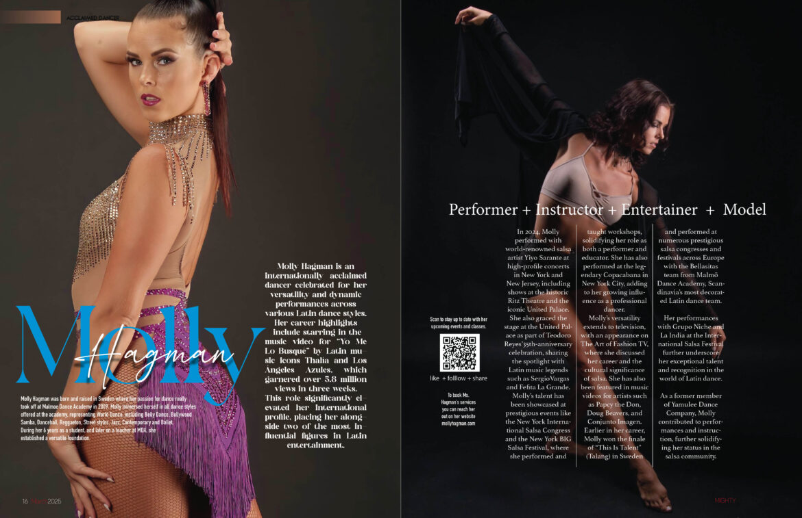 Molly’s versatility extends to television, with an appearance on The Art of Fashion TV, where she discussed her career and the cultural significance of salsa. She has also been featured in music videos for artists such as Papcy the Don, Doug Beavers, and Conjunto Imagen.